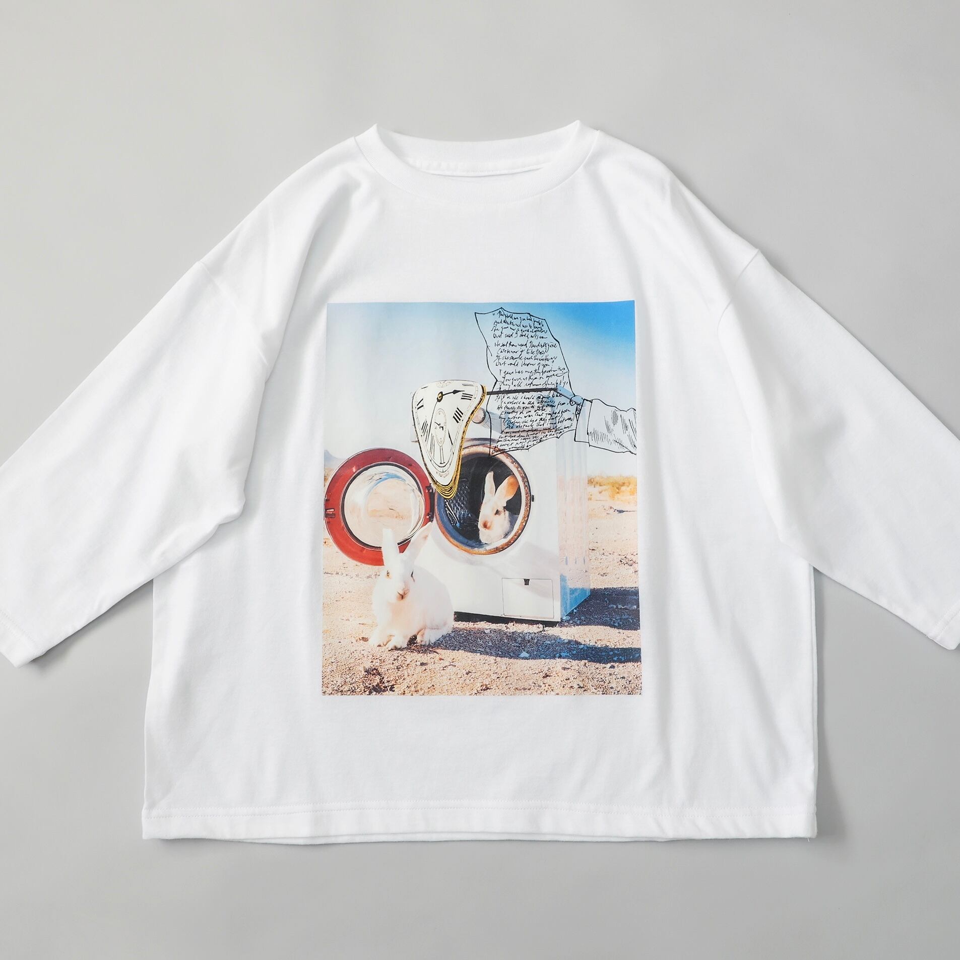 洗濯機から出てくるうさぎと不思議の国のアリスの物語を重ね合わせたイメージのTシャツ。
